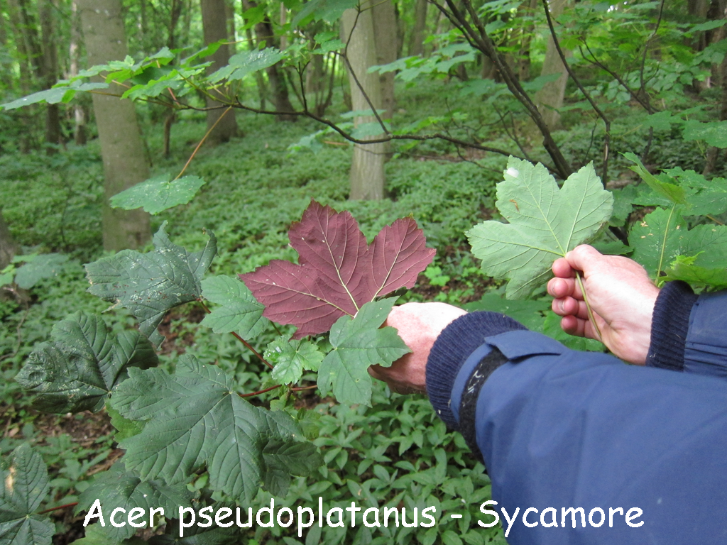Whether sycamore is 'native' or not is debated. Classed as a 'pioneer' species, quickly able to colonise open or scrub land. Its winged seeds (samaras) spread easily, grows quickly and its very large leaves create dense shade that suppresses competition in the understorey and woodland floor. Unlike our native Field Maple, sycamore leaves are dog-toothed. There are several well-established sycamore and a great many saplings and invasive young trees that need to be removed to help sustainability of the rich mix of native apecies across the whole woodland. Sycamore trees are generally better suited to open or parkland planting.
